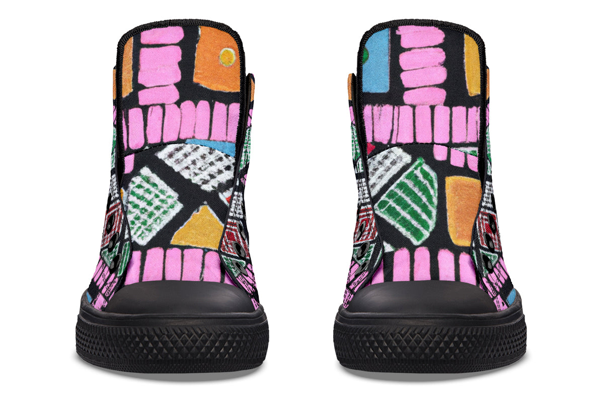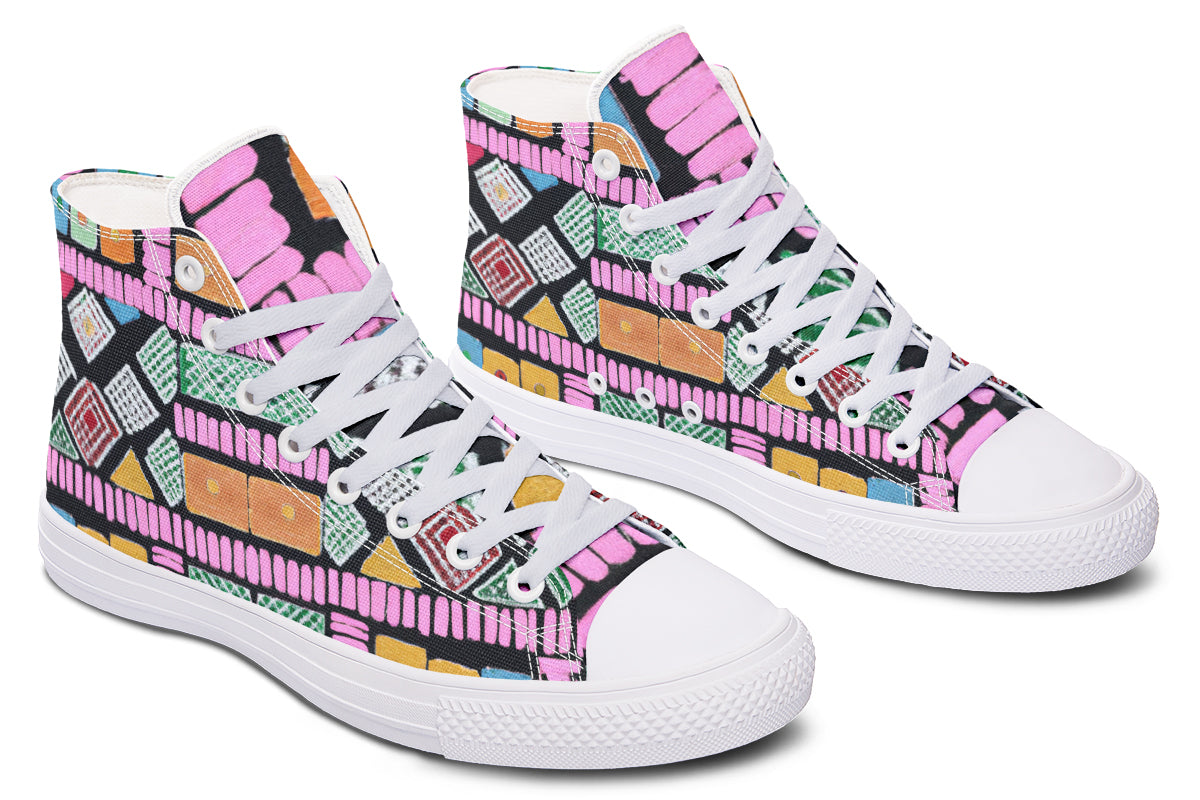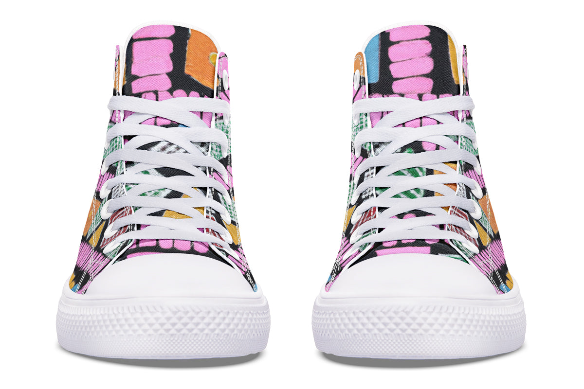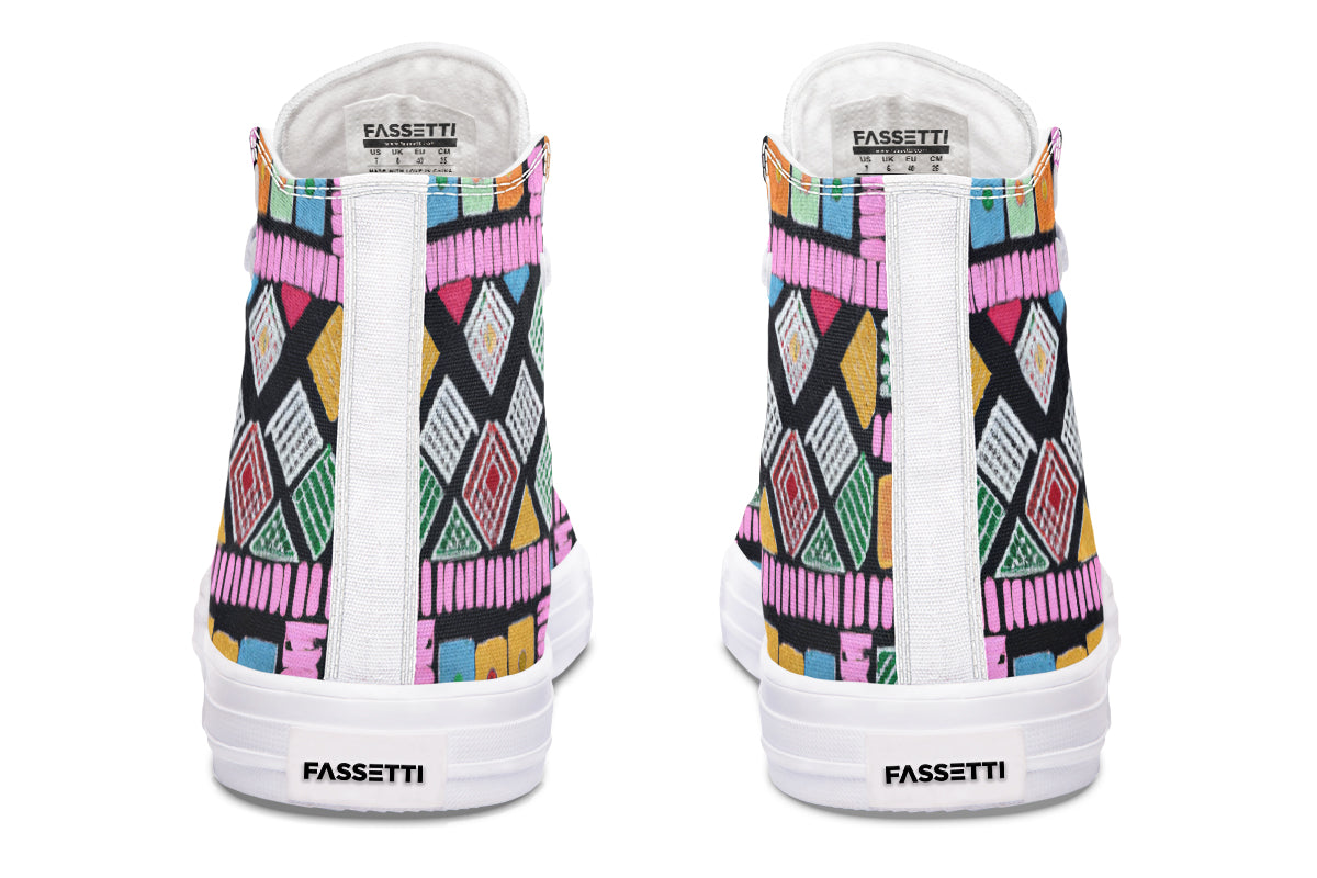 Step up your style with our Fassetti High Tops, designed to be true to size and perfect for wider feet. These high tops feature a removable insole for added convenience and are crafted from top-quality materials, including durable canvas fabric and a sturdy rubber outsole. With vibrant colors and exceptional print quality, each pair is custom made just for you, ensuring you stand out with every step. Elevate your look with high tops that blend fashion, comfort, and a personalized touch.